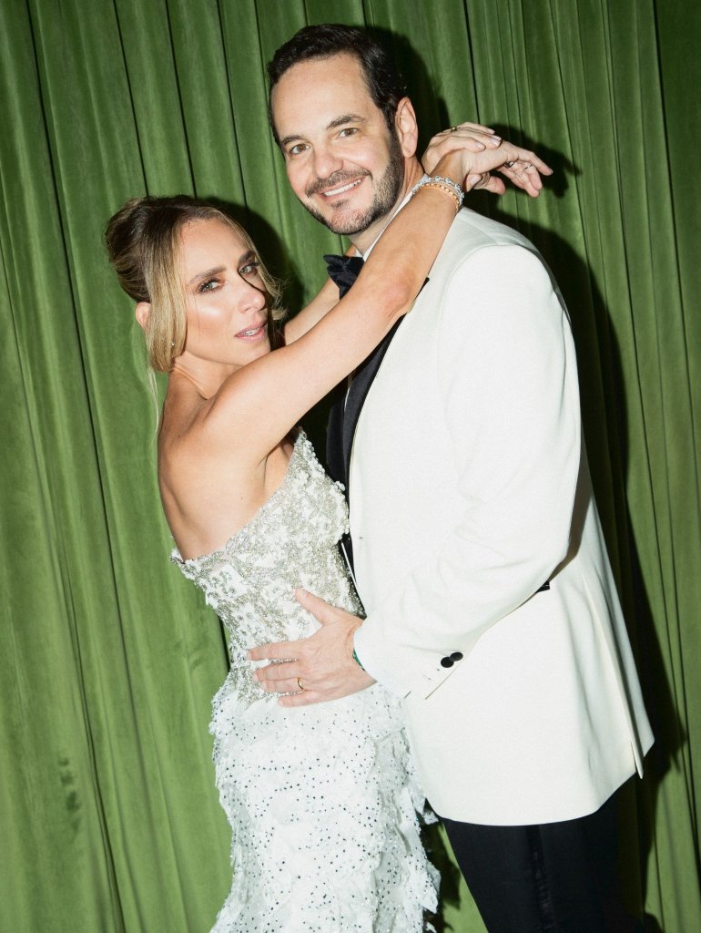 Para a ocasião, Lethicia criou seu próprio vestido, um modelo que conversa com o imaginário bridal, mas com atitude e brilho de red carpet. “Eu queria um modelo que remetesse ao clima da celebração: uma festa black tie, não um casamento. Por mais que quisesse uma áurea de noiva, meu desejo era um vestido de gala que lembrasse o espírito do meu vestido de casamento de 20 anos atrás, que foi assinado por Vera Wang , já que na época, apesar da paixão por esse universo bridal, eu ainda não desenhava para noivas”, conta.