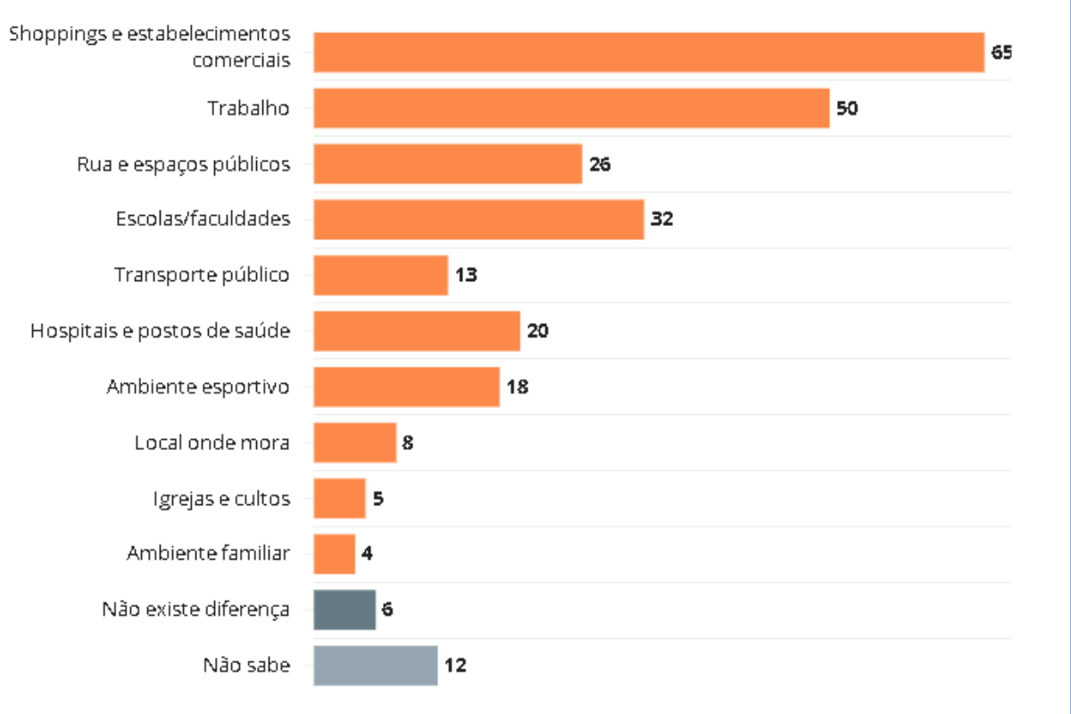 Depois dos estabelecimentos comerciais, os lugares mais citados foram o trabalho, com 44%, incluindo processos de seleção, dia a dia e promoção profissional; e as ruas e os espaços públicos de convivência, com 31%, como parques e praças.