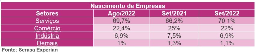 Ao todo, foram criados 316.238 novos negócios no país. Historicamente, o setor de serviços se destaca com a maior parcela das aberturas e em setembro não foi diferente: 70,1% do total.