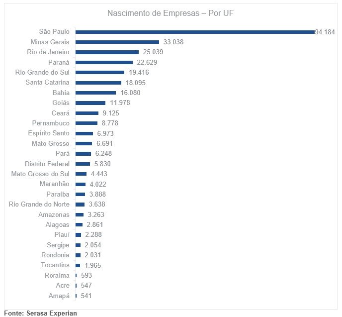 Já em relação às unidades federativas (UFs), três estados do Sudeste detiveram a maior parte dos novos empreendimentos: São Paulo (94.184), Minas Gerais (33.038) e Rio de Janeiro (25.039). Na análise da menor participação estão Roraima (593), Acre (547) e Amapá (541).