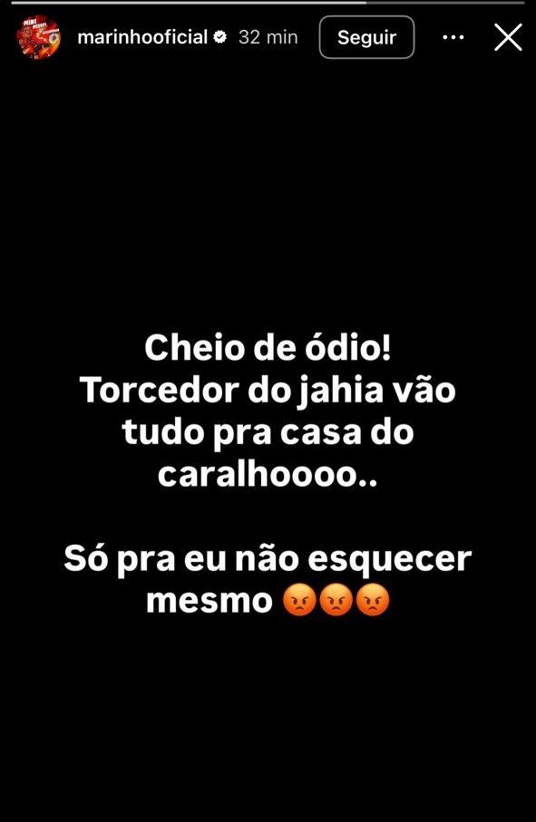 Após ficar com o vice-campeonato do Campeonato Baiano, o atacante Marinho, do  Vitória, usou as redes sociais para desabafar e xingar torcedores do Bahia. O camisa 7 rubro-negro se mostrou irritado com as provocações após a decisão do último sábado (7). Em uma publicação, o jogador afirmou estar “cheio de ódio”, reagindo às provocações enviadas por torcedores rivais.