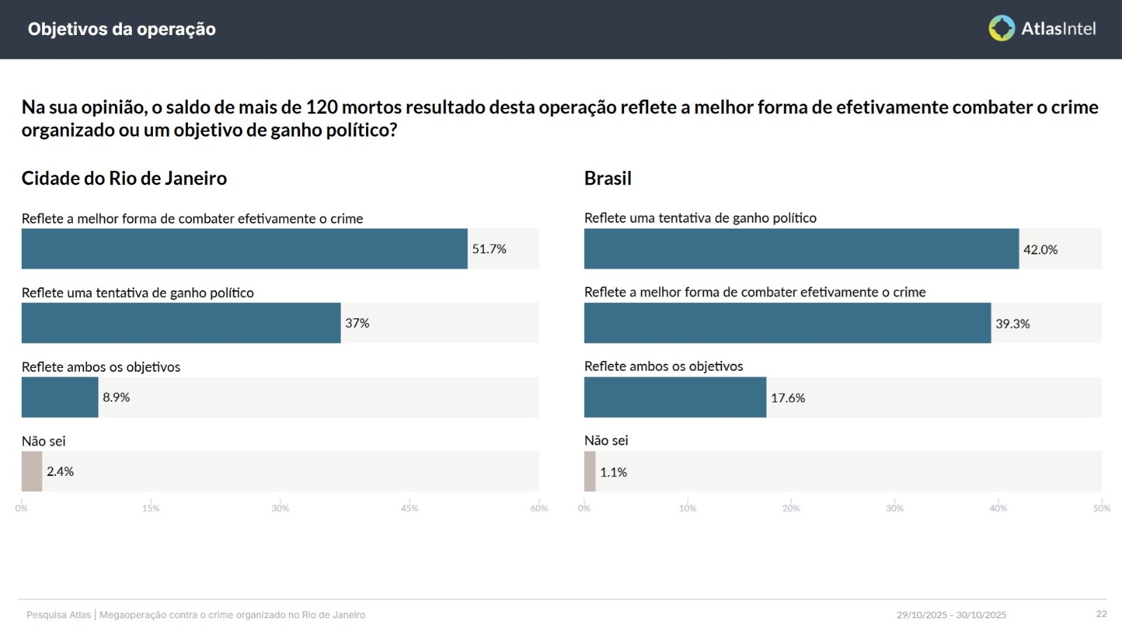 Grande parte dos brasileiros (42%) acredita que a megaoperação do Rio de Janeiro reflete uma tentativa de ganho político, enquanto outra parcela expressiva (39,3%) vê a ação como a melhor forma de combater efetivamente o crime. Os dados constam na última pesquisa AtlasIntel, divulgada nesta sexta-feira (31).