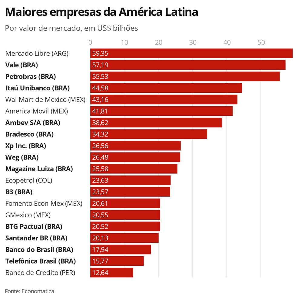 Segundo uma pesquisa realizada pela consultoria Economatica, o Mercado Livre é a maior empresa da América Latina em valor de mercado. Com valor equivalente a US$ 59,3 bilhões nas ações da bolsa na sexta-feira (7), a empresa argentina tem valorização de 108,7% em relação ao valor em 1º de janeiro de 2020, que era de US$ 28,4 bilhões. Com esse resultado, o Mercado Livre dobrou de tamanho com avanço do comércio eletrônico em meio à pandemia da Covid-19, doença causada pelo novo coronavírus.