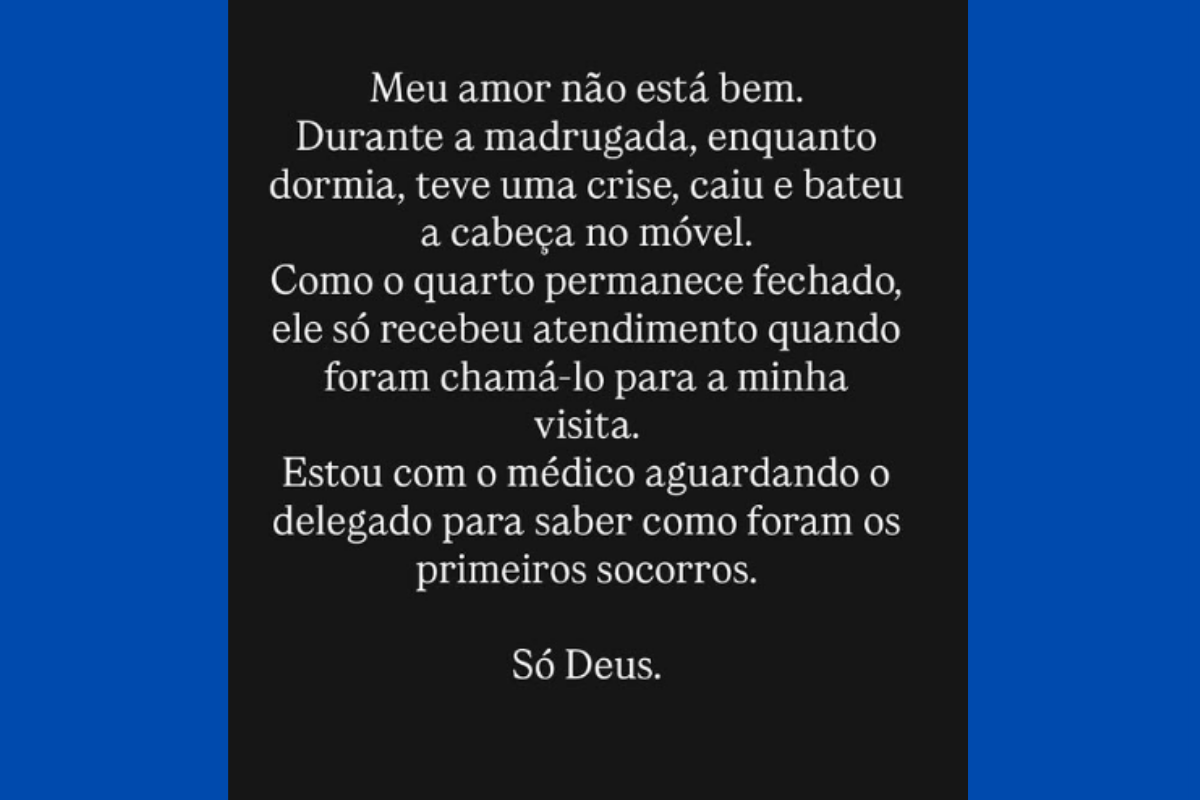 "Meu amor não está bem. Durante a madrugada, enquanto dormia, teve uma crise, caiu e bateu a cabeça no móvel. Como o quarto permanece fechado, ele só recebeu atendimento quando foram chamá-lo para a minha visita. Estou com o médico aguardando o delegado para saber como foram os primeiros socorros. Só Deus", escreveu Michelle.