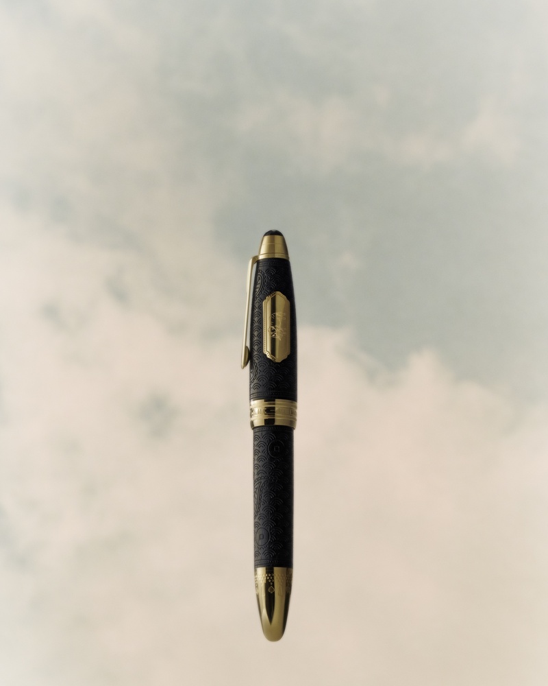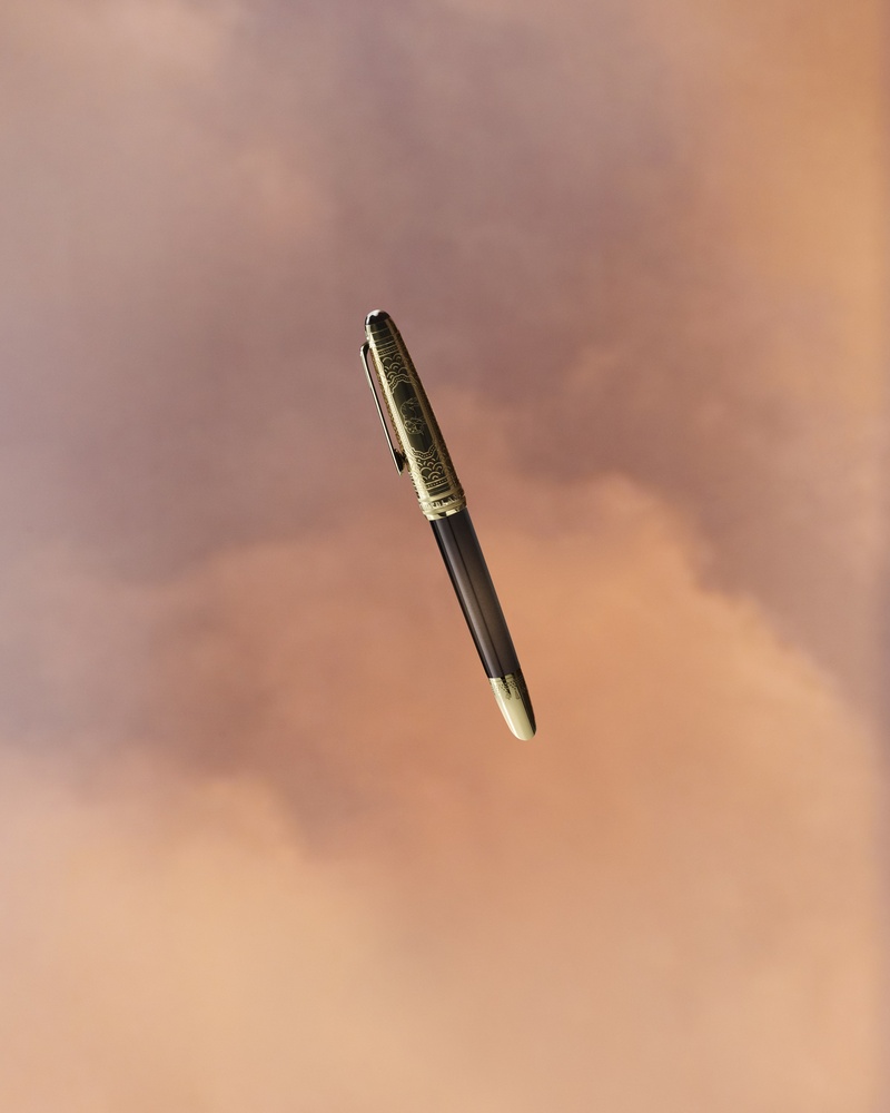 - Meisterstück Volta ao Mundo em 80 Dias Doué Classique com corpo de metal coberto com laca antracite degradada e tampa revestida a ouro gravada com padrões de boa sorte indianos, chineses, japoneses e a gravação do elefante. Disponível em caneta-tinteiro com pena em ouro Au750, rollerball ou esferográfica.