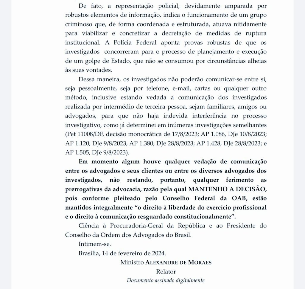 Atendendo ao pedido da Ordem dos Advogados do Brasil (OAB), o magistrado negou que a decisão anterior, emitida em 8 de fevereiro e que autorizou a megaoperação da PF, proibisse a comunicação entre os advogados.