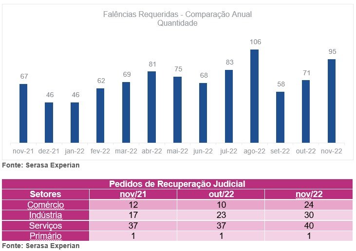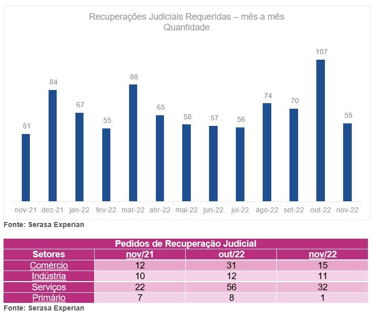 De acordo com dados do Indicador de Falências e Recuperação Judicial da Serasa Experian, o mês de novembro registrou 59 pedidos de recuperação judicial no Brasil. Em comparação com o mesmo período de 2021, a alta foi de 15,7% com destaque para o setor de Serviços, com 32 requerimentos.