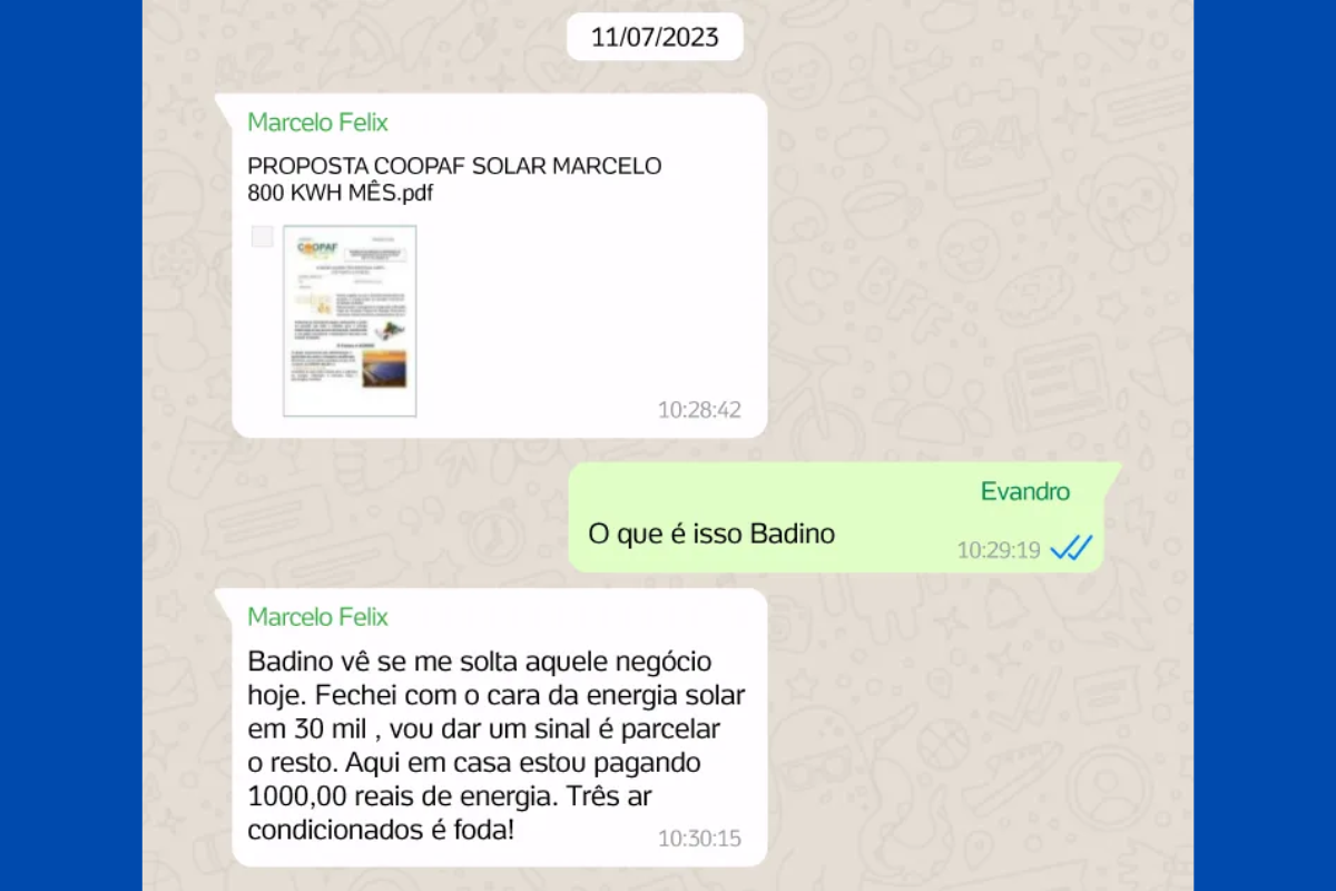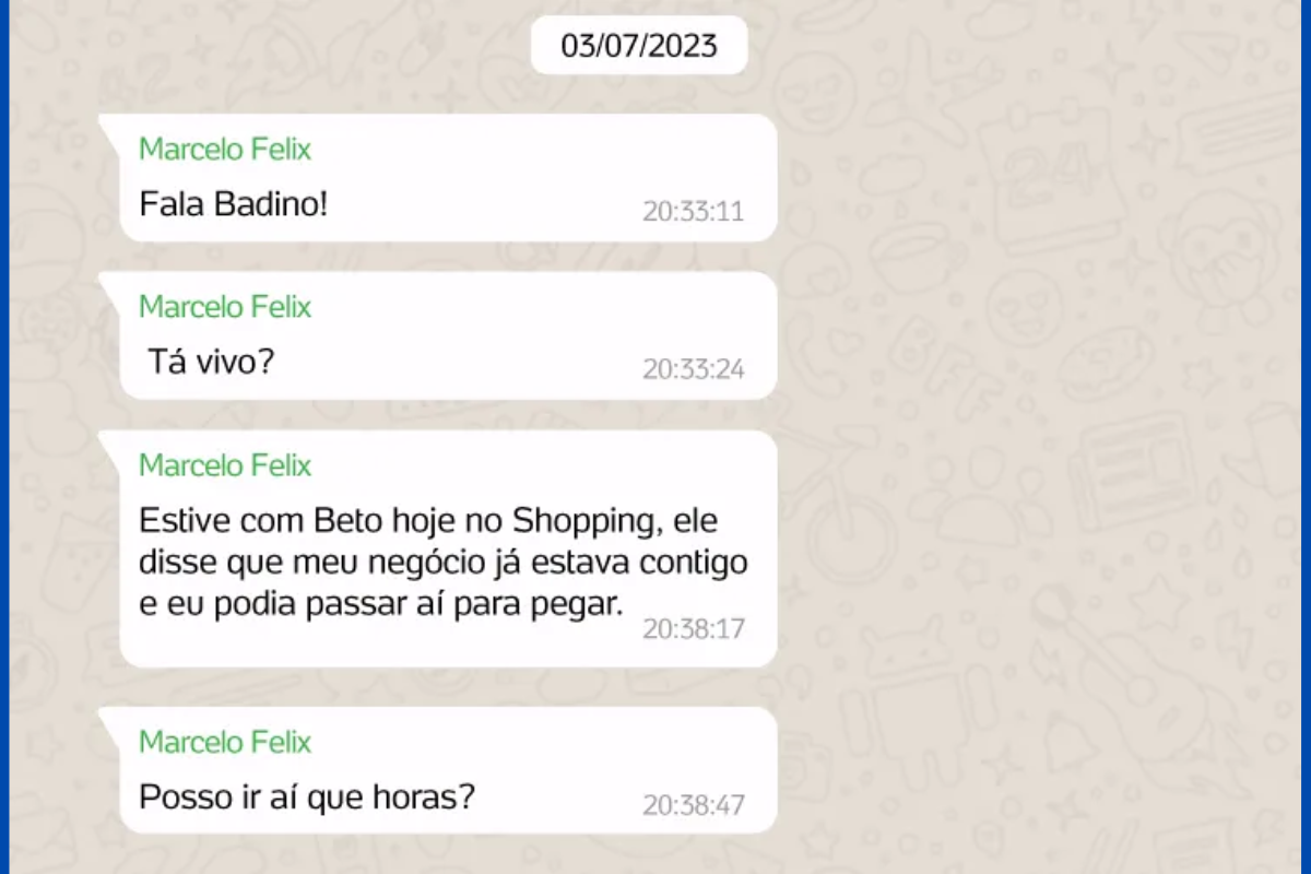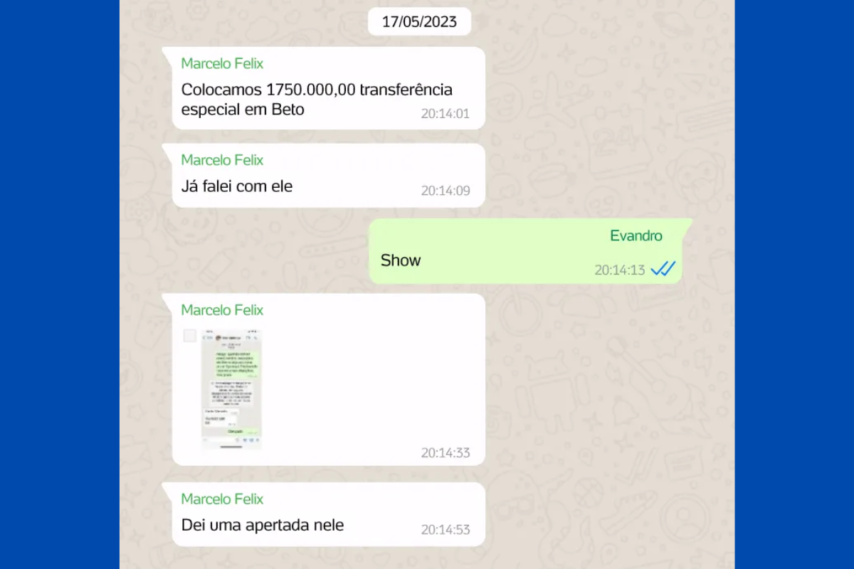 As mensagens obtidas pela PF são do assessor de Félix, Marcelo Gomes, e o empresário Evandro Baldino do Nascimento, apontado como um dos membros da suposta organização criminosa investigada na Overclean.