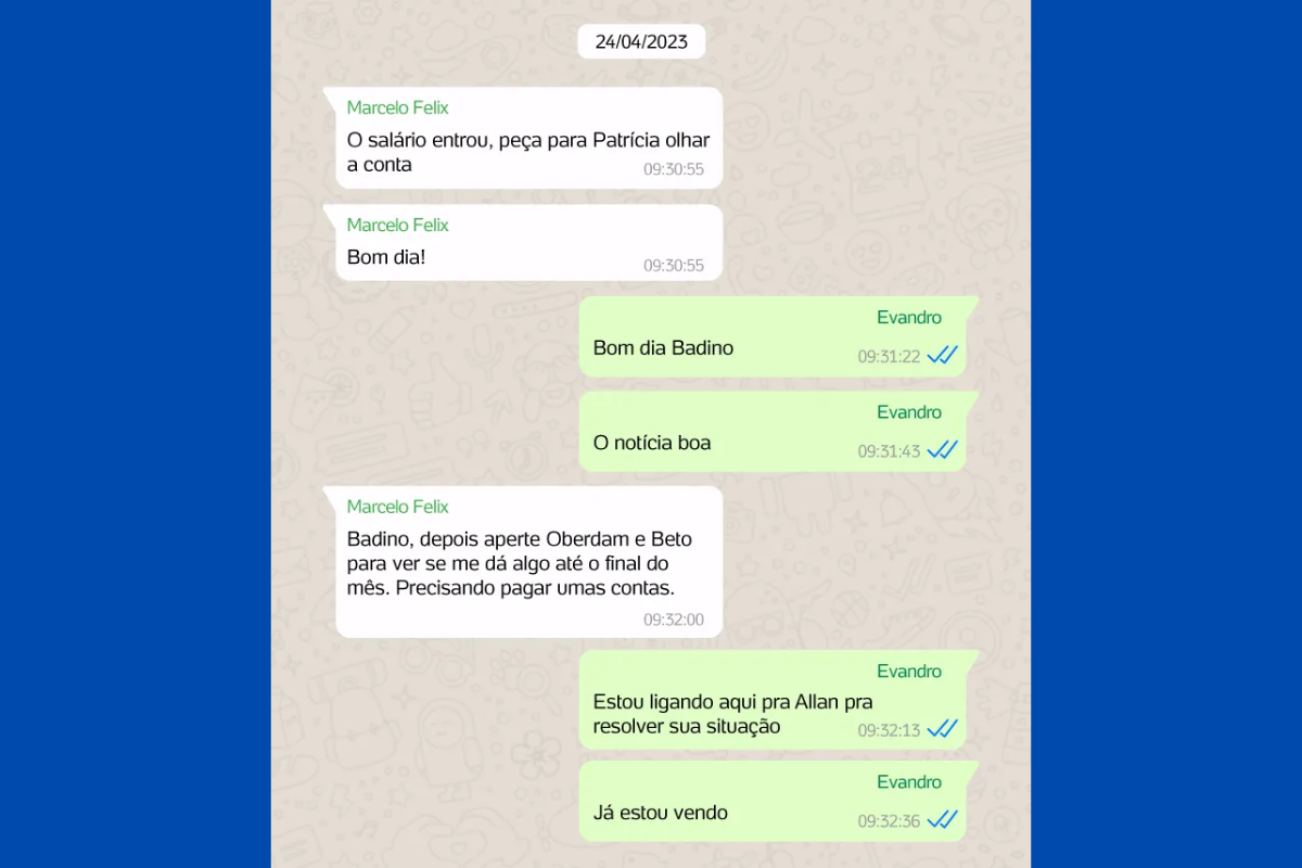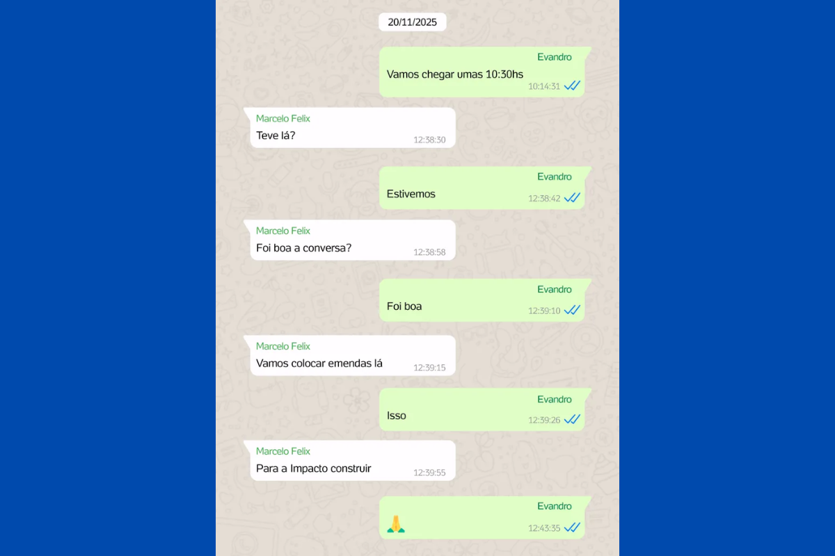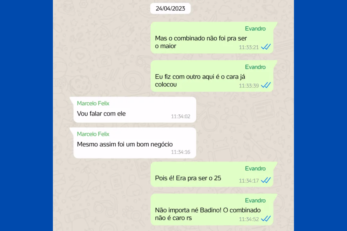 Em diversas ocasiões, entre 2023 e 2024, Marcelo pressiona Evandro e pede dinheiro. Nas eleições de 2024, por exemplo, Marcelo pede R$ 75 mil para Evandro. Em outubro de 2024, ele pede uma transferência via Pix no valor de R$ 20 mil, e Evandro afirma que conversariam no dia seguinte.