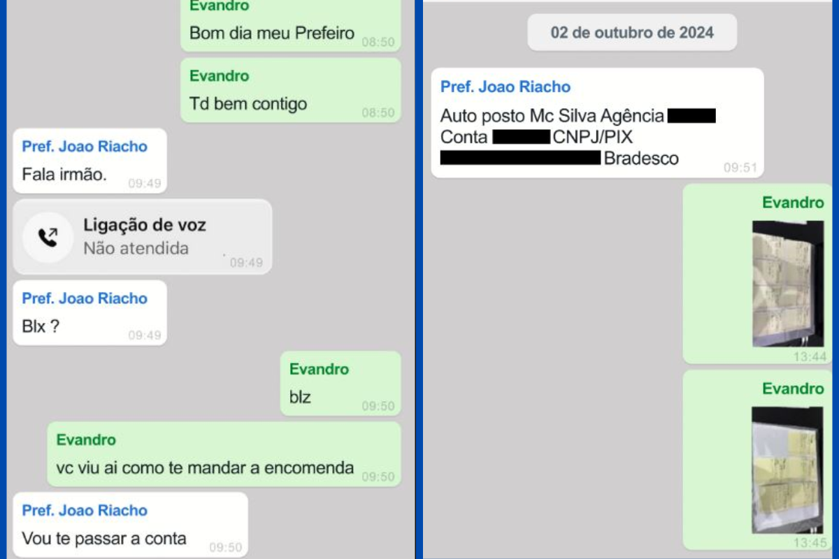 Nas conversas, Evandro questiona de que forma enviaria a "encomenda" ao prefeito de Riacho de Santana, que por sua vez, encaminha os dados bancários para depósito. Em seguida, Evandro encaminha fotos de comprovantes de pagamento. Confira:
