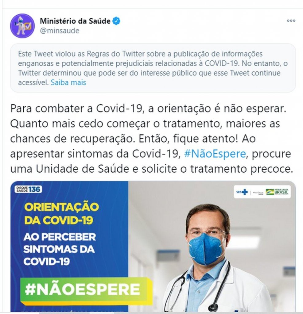 Nesta semana, o Twitter colocou um alerta em uma publicação do Ministério da Saúde, apontando que houve "a publicação de informações enganosas e potencialmente prejudiciais" relacionadas à Covid-19. No post, a pasta indicava o "tratamento precoce" contra a doença.