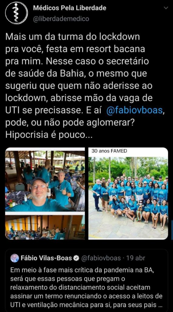 Durante coletiva de imprensa nesta terça-feira (24), o governador Rui Costa foi questionado a respeito da foto que circulou em sites de notícias baianos, em que mostra o secretário estadual de Saúde, Fábio Vilas-Boas sem máscara. A denúncia foi feita pelo Grupo de Médicos Pela Liberdade.