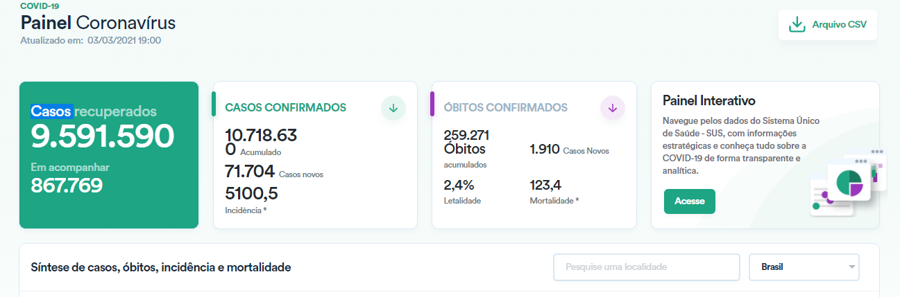 Também em 24h, mais 71.704 novos casos foram confirmados, totalizando 10.718.630 infectados desde o início da pandemia no Brasil.