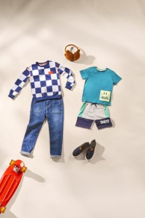 Para os pequenos, as clássicas estampas de personagens continuam na coleção. Alguns modelos são perfeitos para combinações “mini me” em conjunto com os pais, com frases divertidas e estampas florais. A paleta de cores é mais viva e explora os tons de azul.