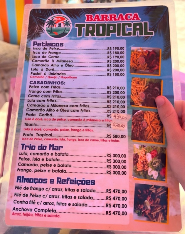 Além disso, o cardápio inclui outras opções com preços elevados, a exemplo de um prato chamado “Titanic” (mistura de lula, camarão, peixe e frango com fritas) por R$ 470, o Prato Geribá por R$ 430 e o Prato Tropical por R$ 580. Até mesmo porções consideradas simples por boa parte dos internautas, como seis pastéis, estariam tabeladas em cerca de R$ 150.