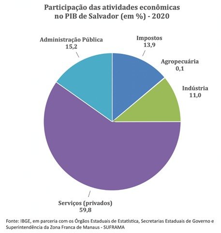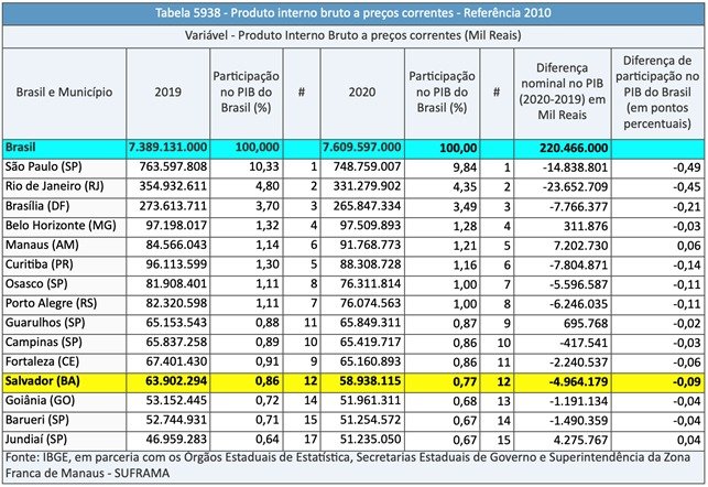 Dados do Instituto Brasileiro de Geografia e Estatística (IBGE), divulgados nesta sexta-feira (16), mostram que o Produto Interno Bruto (PIB) de Salvador foi estimado em R$ 58,938 bilhões em 2020. Frente a 2019, quando o valor havia sido de R$ 63,902 bilhões, houve uma queda nominal de 7,8%.