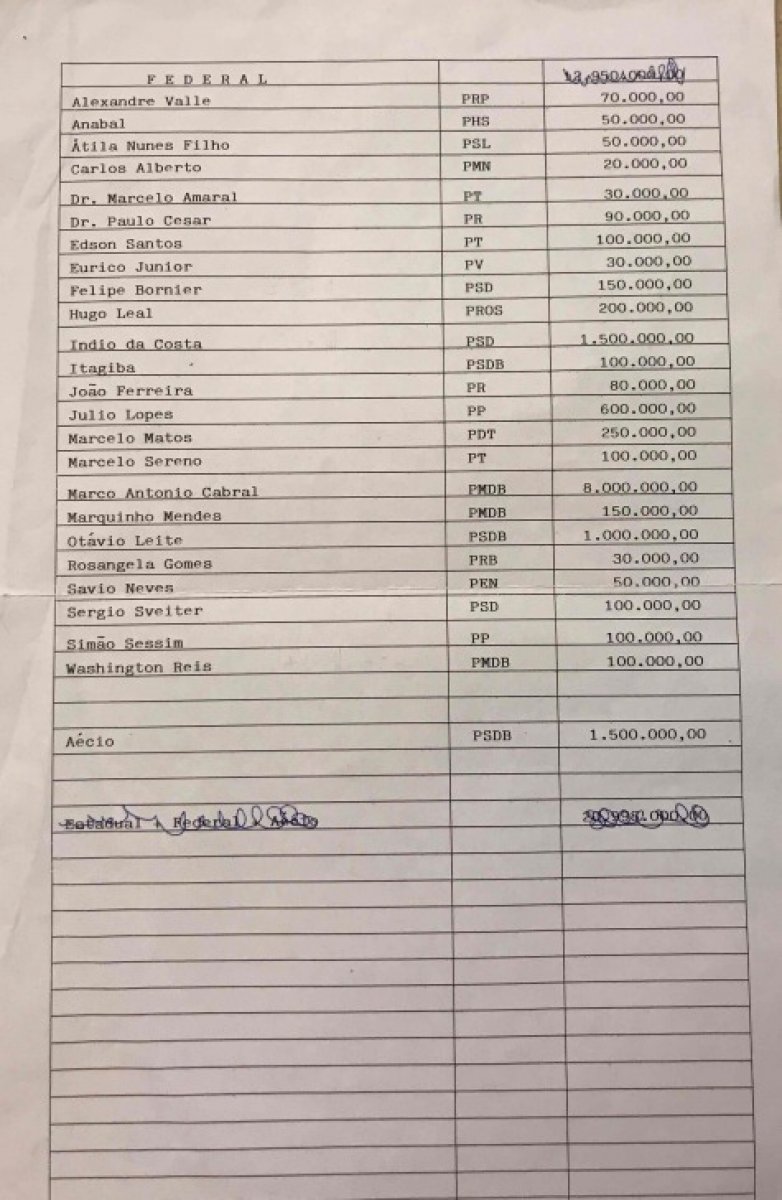O executivo da Fetranspor entregou uma tabela com os nomes de políticos que cujos pagamentos haviam sido efetuados e que deveriam ser divididos e pagos pelas duas entidades.