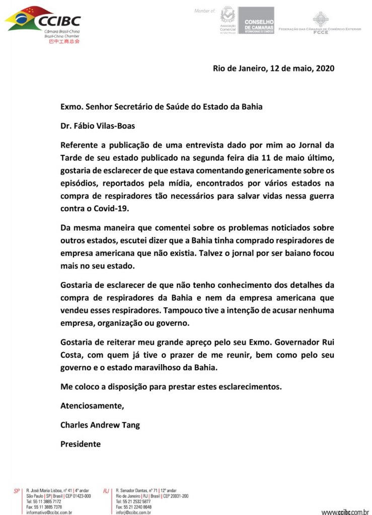 O presidente da Câmara-Brasil-China, Charles Andrew Tang, emitiu um comunicado nesta terça-feira (12) a respeito de entrevista concedida por ele ao jornal A Tarde sobre a compra de respiradores feitas pelos mais diversos estados brasileiros que visam conter a disseminação da Covid-19.