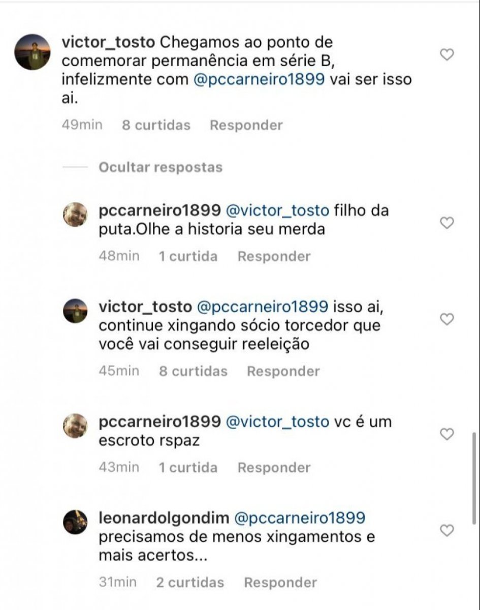 No entanto, Paulo Carneiro não gostou do tom do comentário e xingou o torcedor. Em seguida, Carneio mandou o torcedor prestar atenção na história do Leão. Com isso, outro sócio escreveu que o time precisa de “menos xingamentos e mais acertos”.