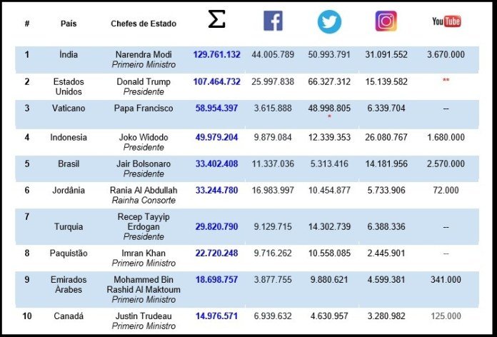 Confira a tabela abaixo que sumariza as informações do ranking digital dos chefes de estado.