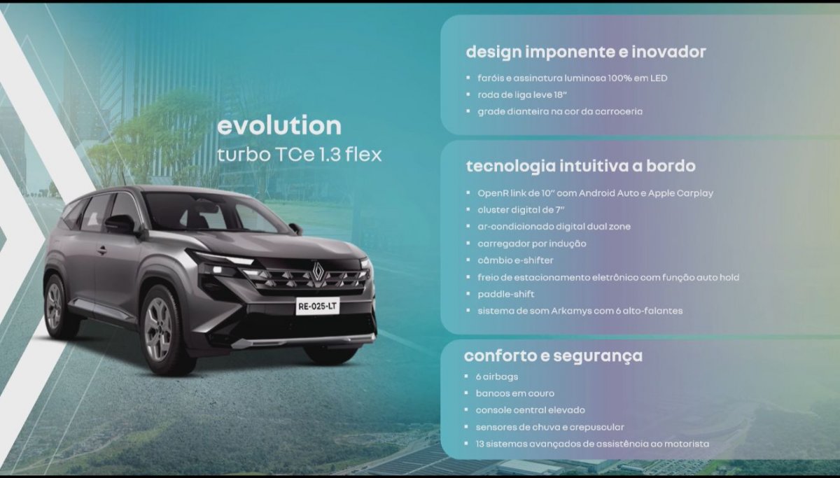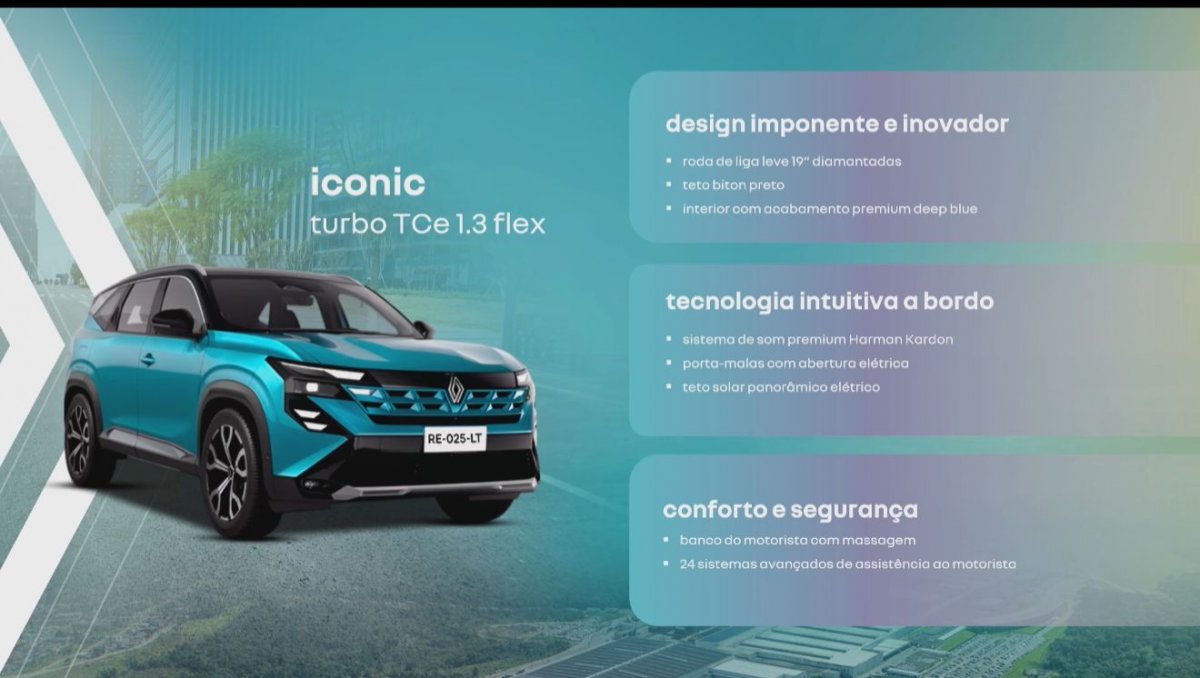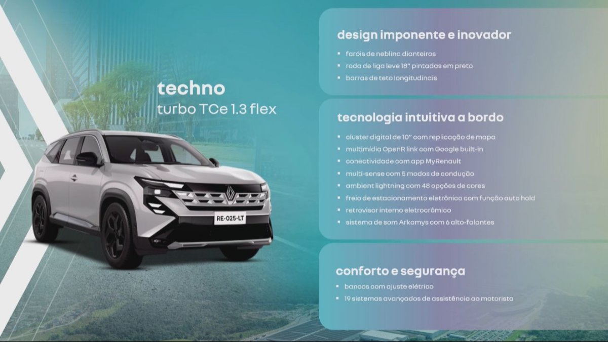 Ganha farois e de neblina em LED, rodas aro 18 com pintura preta, barras de teto longitudinais, painel digital de 10 polegadas, aplicativo MyRenault, cinco modos de condução, luzes ambiente com 48 cores, retrovisor fotocrômico, bancos dianteiros elétricos e ADAS com 19 itens