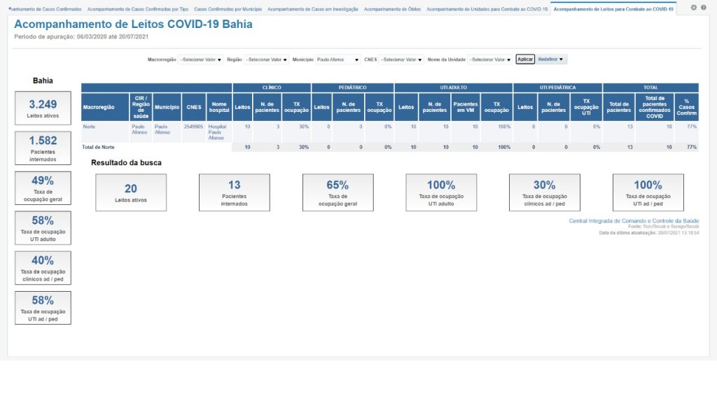 Além disso, a pasta afirmou que são 14 leitos na unidade. Desses, dez leitos estão no Hospital Municipal de Paulo Afonso (HMPA) e quatro na UPA Covid – Hospital de Urgência. A assessoria da prefeitura de Paulo Afonso reafirmou ao Farol da Bahia que a Sesab contabiliza números que divergem da realidade do município. “A taxa de ocupação difere da registrada pela Secretaria de Saúde do Estado (Sesab), porque a mesma só considera os dez leitos do HMPA, sem considerar os quatro da UPA Covid e, dessa forma, o percentual fica diferenciado”, diz trecho da nota. A  Sesab confirmou a informação ao Farol da Bahia: “No painel consta apenas leitos do Hospital Municipal de Paulo Afonso”.