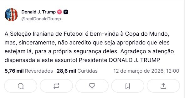 A declaração foi feita após Trump afirmar que os iranianos seriam bem-vindos para disputar o Mundial, mas que deveriam se preocupar com a própria segurança durante o torneio. A manifestação do presidente norte-americano foi publicada na rede social Truth Social.