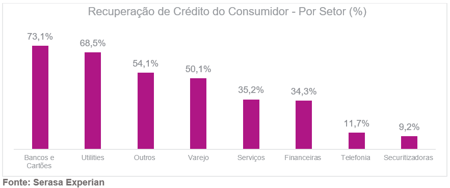 Em janeiro, segundo dados do Indicador de Recuperação de Crédito da Serasa Experian, 73,1% das dívidas do setor de Bancos e Cartões foram pagas por consumidores inadimplentes em até 60 dias após a negativação. O segmento de Utilities, que engloba contas de luz, água e gás, ficou em segundo lugar, com 68,5% dos débitos liquidados.