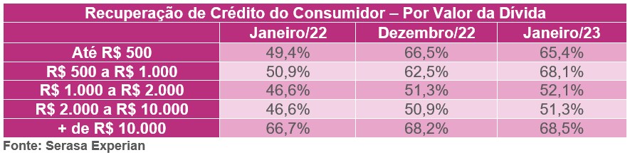 Na análise por região, ainda em janeiro, o Centro-Oeste teve a melhor taxa de recuperação, com 66,9% das dívidas negativadas ressarcidas. Em sequência estava o Sul (63,6%), seguido pelo Nordeste (63,2%), Sudeste (63,0%) e Norte (62,8%).