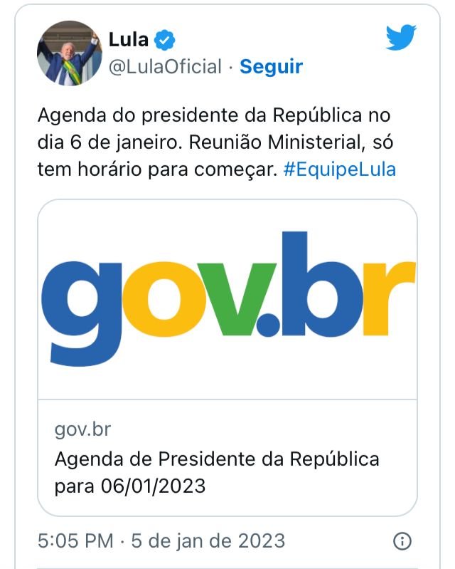 A declaração foi feita através das redes sociais. "Agenda do presidente da República no dia 6 de janeiro. Reunião Ministerial, só tem horário para começar. #EquipeLula", escreveu.