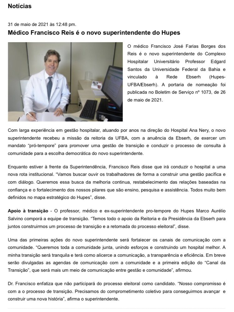 Nomeado através da Portaria SEI 80/21 de 24/05, Francisco Reis, médico e ex-diretor do Hospital Ana Nery, assumiu o cargo com a determinação do Reitor da UFBA, João Carlos Salles para a realização “com a máxima brevidade" de nova consulta para indicar Superintendente definitivo para o HUPES.