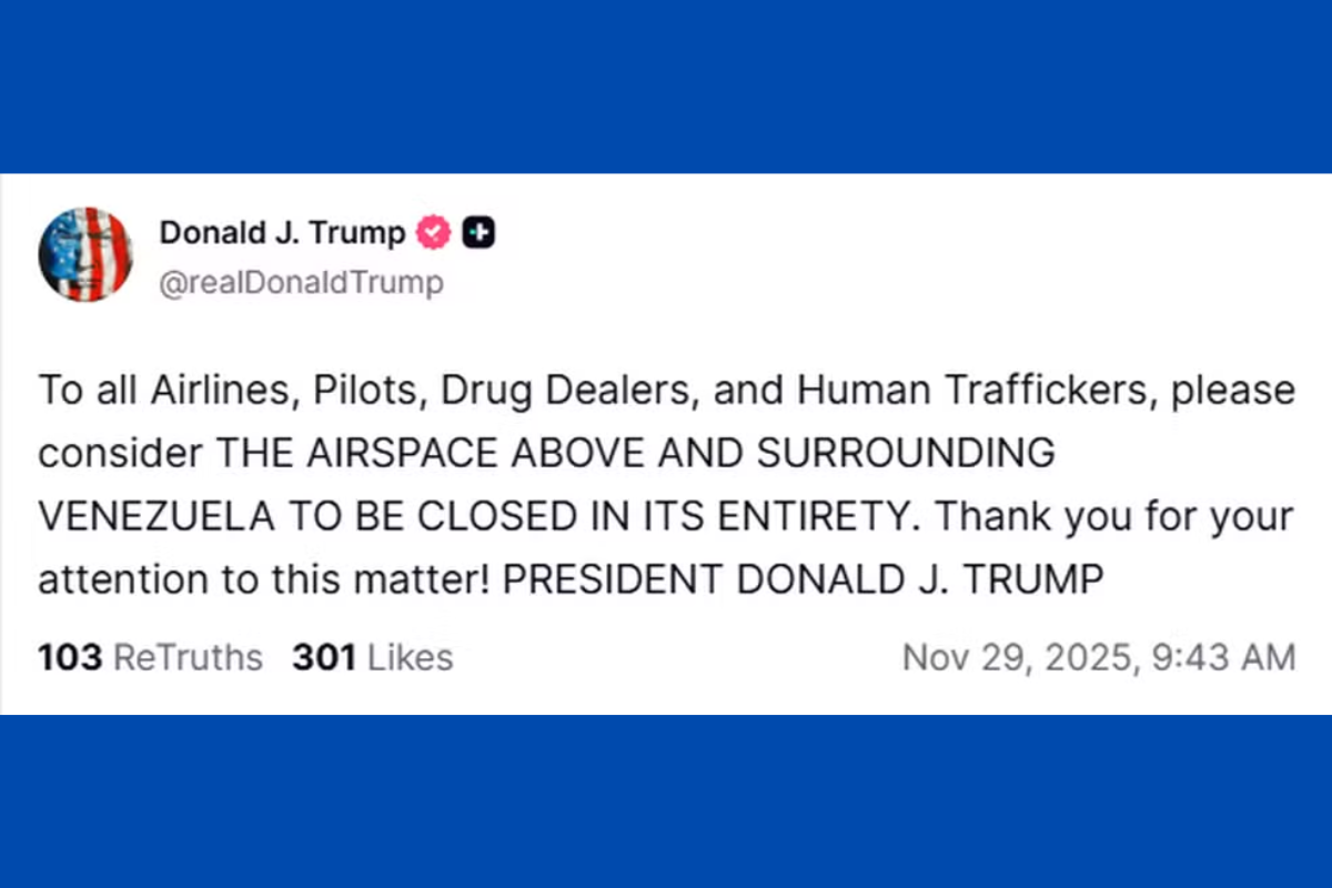 No dia 21 de novembro, Trump já havia alertado que companhias aéreas evitassem sobrevoar o espaço aéreo venezuelano. Diante da recomendação, várias companhias aéreas suspenderam voos que cruzaram o território venezuelano ou que tinham o país como destino.