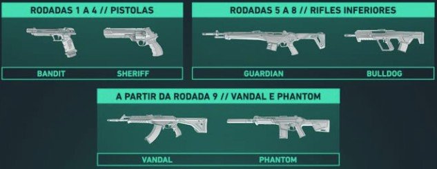 Em relação às armas, entre as rodadas 1 a 4 os jogadores podem escolher a "Bandit" ou "Sheriff". Entre as rodadas 5 a 8, podem ser selecionadas a "Guardian" e "Bulldog". Já a partir da Rodada 9, as armas ofertadas são "Vandal" e "Phantom".
