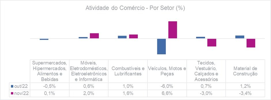 De acordo com o economista da Serasa Experian, Luiz Rabi, a alta foi puxada especialmente pelo desempenho do setor de veículos, motos e peças, pois conforme apontado pela Federação Nacional da Distribuição de Veículos Automotores, novembro foi o segundo melhor mês de 2022 em termos de vendas de veículos novos. "Ainda assim, os outros segmentos do varejo apresentaram resultados mistos, refletindo o cenário econômico ainda bastante desafiador para os comerciantes do país", finaliza o economista.