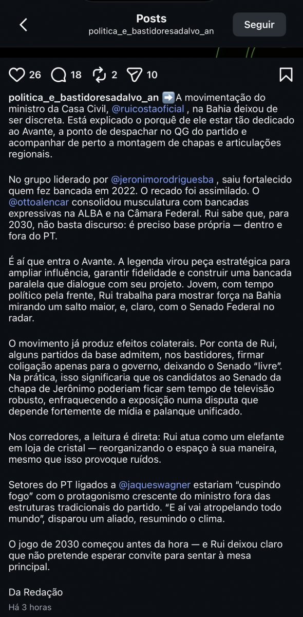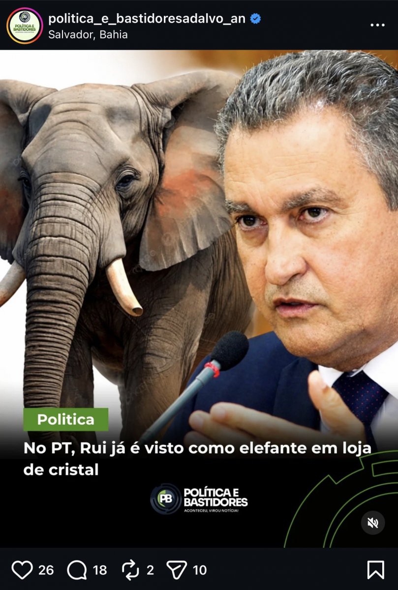 “O movimento já produz efeitos colaterais. Por conta de Rui, alguns partidos da base admitem, nos bastidores, firmar coligação apenas para o governo, deixando o Senado ‘livre’. Na prática, isso significaria que os candidatos ao Senado da chapa de Jerônimo poderiam ficar sem tempo de televisão robusto, enfraquecendo a exposição numa disputa que depende fortemente de mídia e palanque unificado. Nos corredores, a leitura é direta: Rui atua como um elefante em loja de cristal - reorganizando o espaço à sua maneira, mesmo que isso provoque ruídos", diz o post.