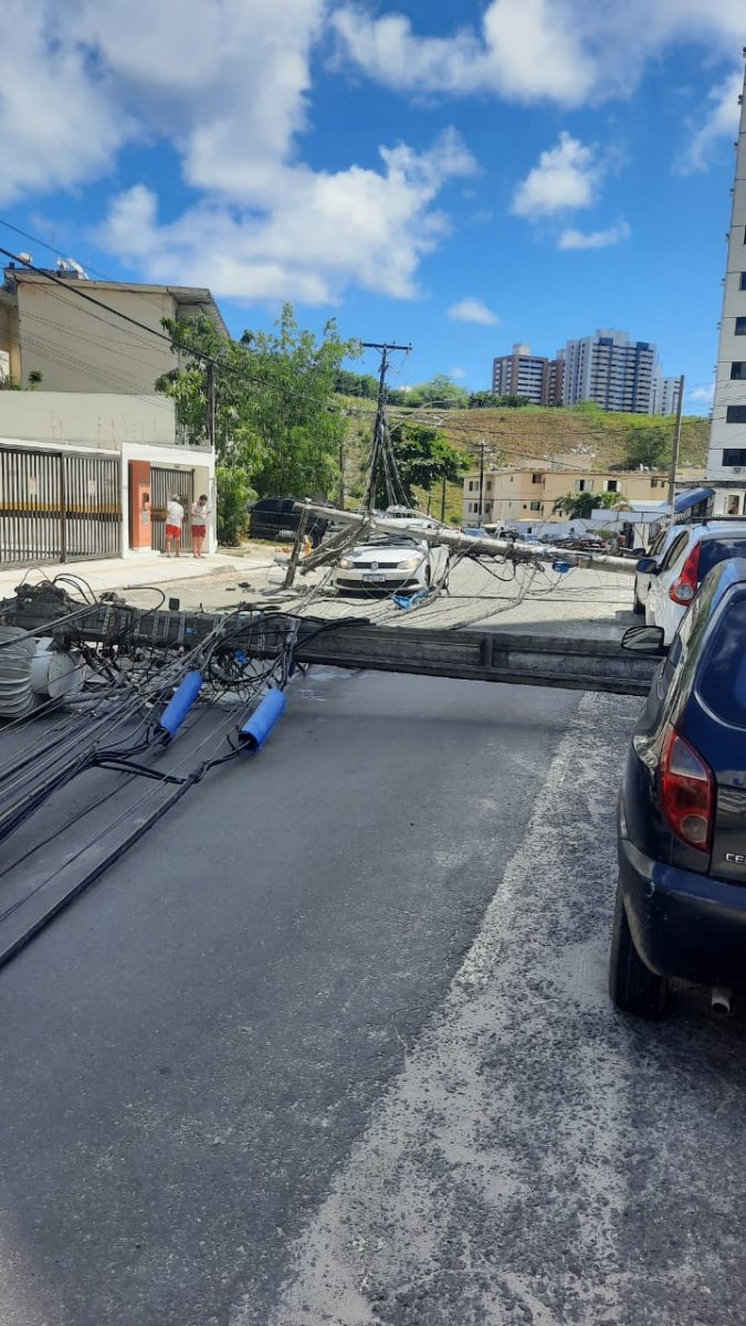 Dois postes caíram na rua das Patativas, no bairro do Imbui, em Salvador, após um caminhão arrastar a fiação. De acordo com um vídeo gravado por moradores, a rua está sem energia.