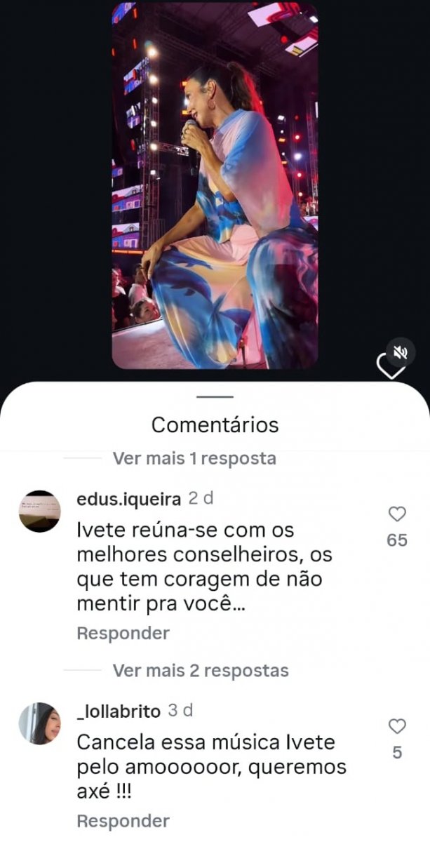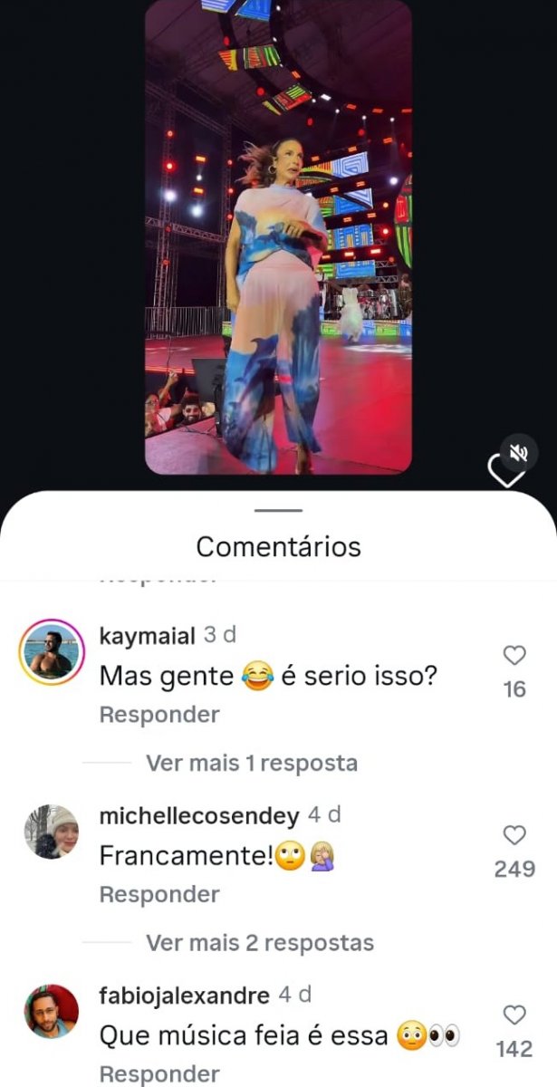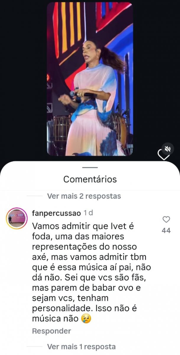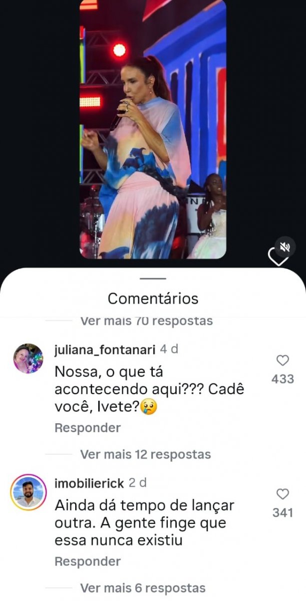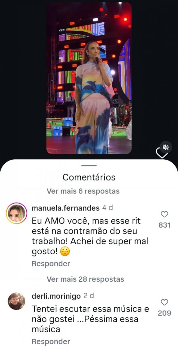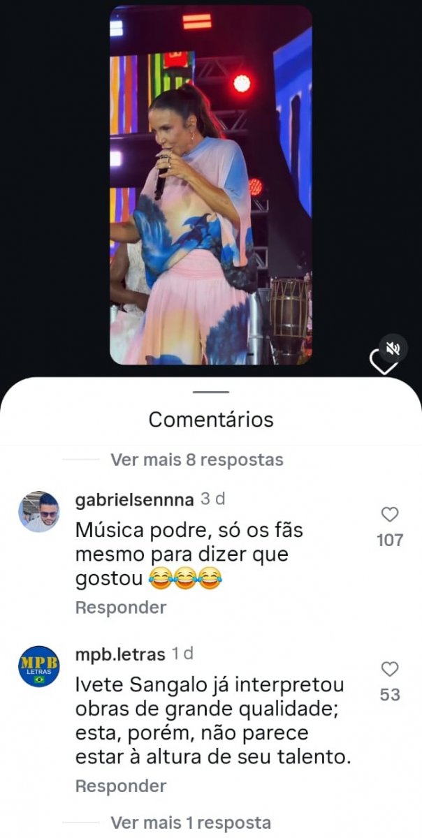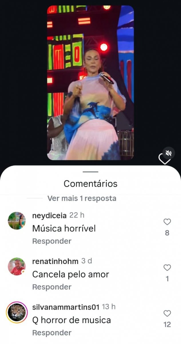 Em um vídeo publicado no Instagram, Ivete aparece interpretando a música durante o Pôr do Som 2026, tradicional apresentação de Daniela Mercury realizada no Farol da Barra, no dia 1º de janeiro. Nos comentários, parte do público demonstrou insatisfação e avaliou a faixa como abaixo do padrão da artista. “Essa música é péssima”, escreveu um internauta.