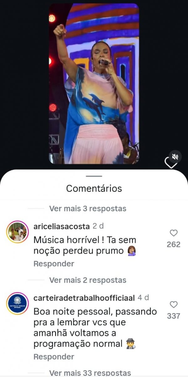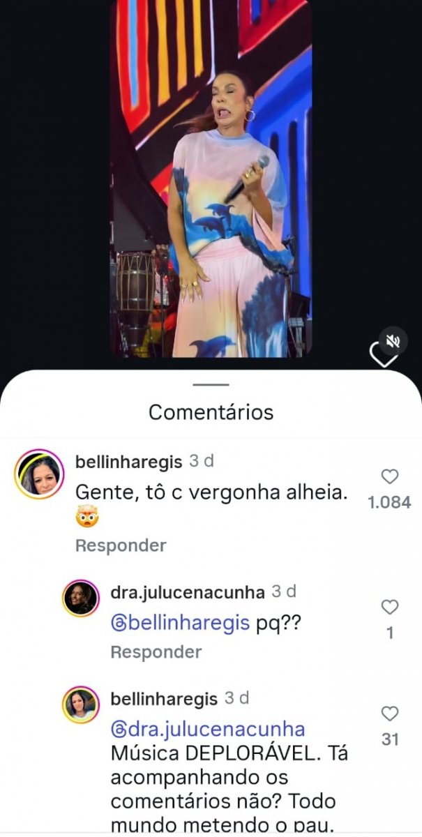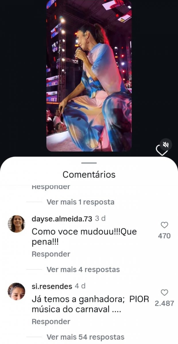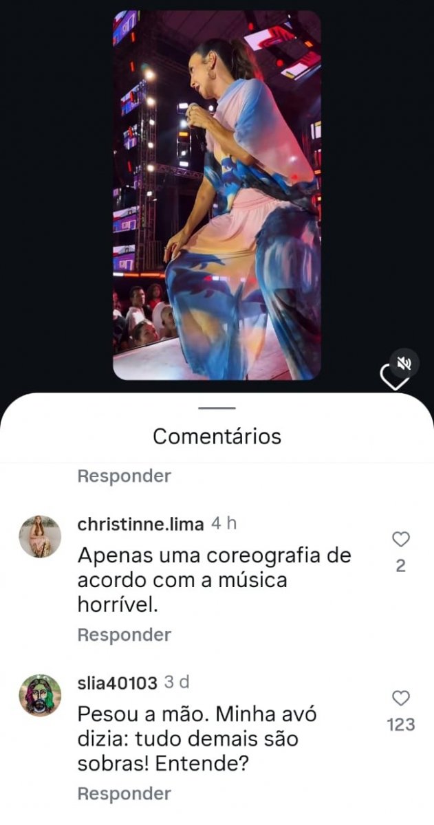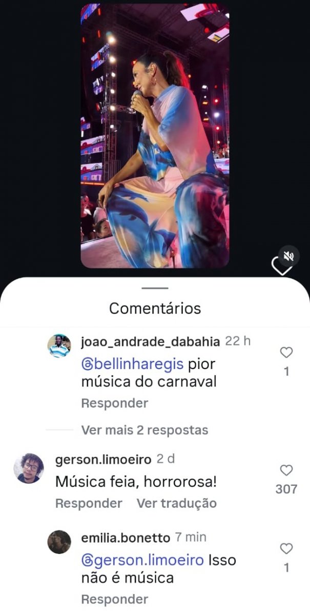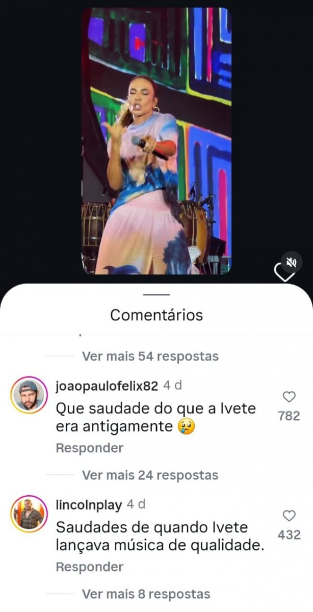 Em um vídeo publicado no Instagram, Ivete aparece interpretando a música durante o Pôr do Som 2026, tradicional apresentação de Daniela Mercury realizada no Farol da Barra, no dia 1º de janeiro. Nos comentários, parte do público demonstrou insatisfação e avaliou a faixa como abaixo do padrão da artista. “Essa música é péssima”, escreveu um internauta.
