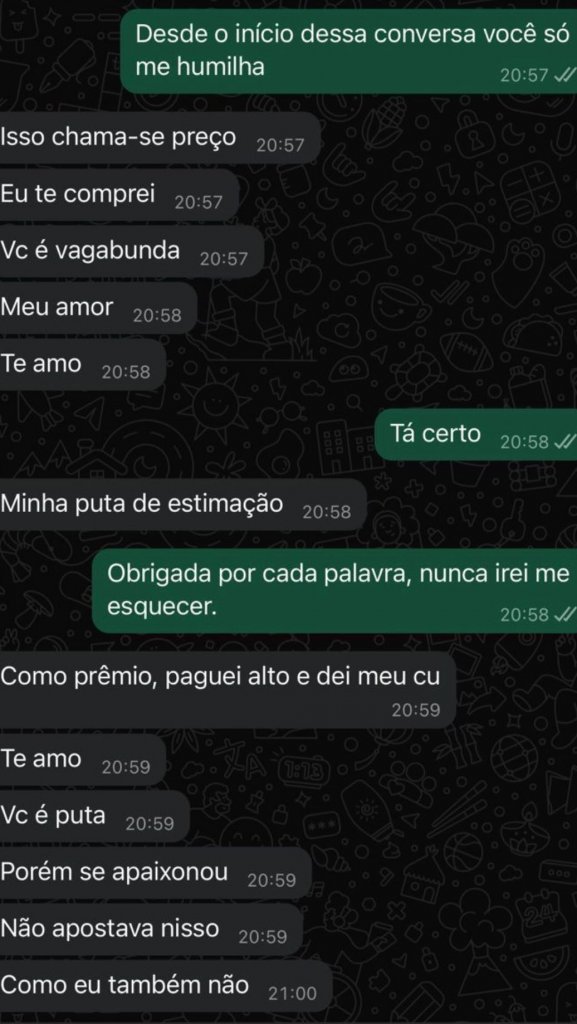 Supostos prints circulam nas redes sociais, onde Renan Braga profere xingamentos contra a vítima e chega a dizer que a comprou