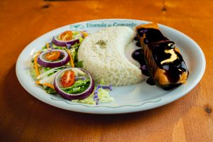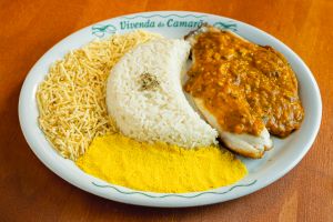 Camarão empanado coberto de muçarela gratinada com molho de queijos. Acompanha arroz e batata palha. Inspirado na culinária nordestina que tem como campeões de vendas o camarão e o queijo coalho (mas o nosso é com muçarela).